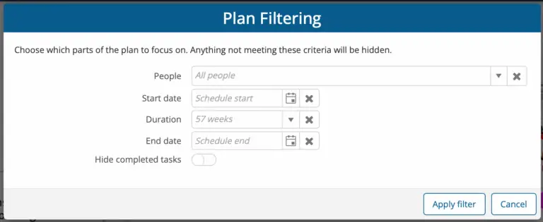 You can now filter both the Whiteboard and Gantt chart by resource and date range.