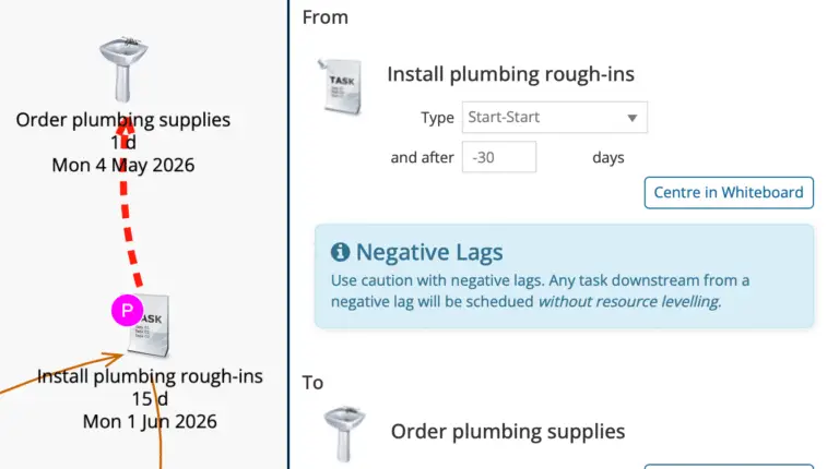 ⚠️ Negative lags should only be used when absolutely necessary. Use Start-Start dependencies with positive lags wherever possible. But when you need a one-off early task, negative lags give you the control to schedule it accurately.