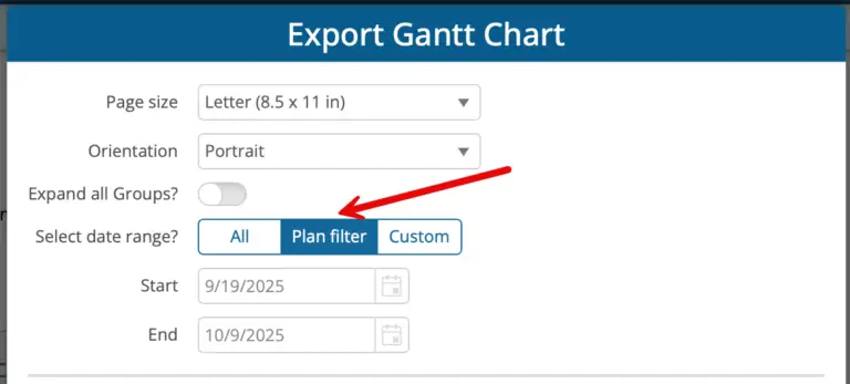 When exporting a Gantt chart to PDF, the export now defaults to the current date filter.